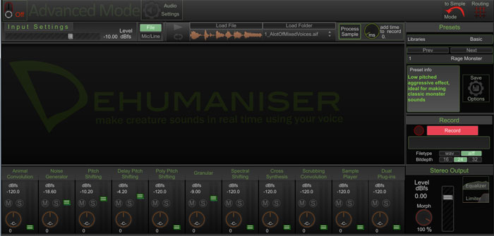 As far as graphical interface goes, I have to say that I personally really like how the Dehumaniser looks and feels. Everything is where one would expect it to be. The advanced mode is far from confusing and each effect can be turned on and off at any time. Once you have clicked the desired effect (click the name of the effect) it gives you all of the options presented in the preview part of the review. There is also a routing section which I haven’t really gotten into but it essentially does what it is supposed to do – routing feels like a breeze especially when you just drag your mouse over the presented fader. Recording and exporting sound also works great and even though you record in one channel (mono) you will get two recordings out of it, one being the processed sample and one which will be your original recording. A great backup if you have to go back to redo some of the samples that you have recorded before.