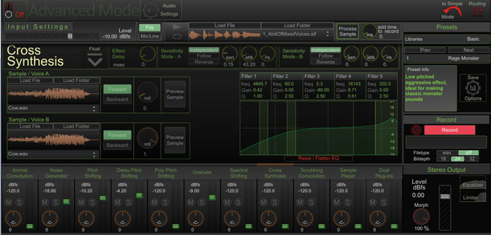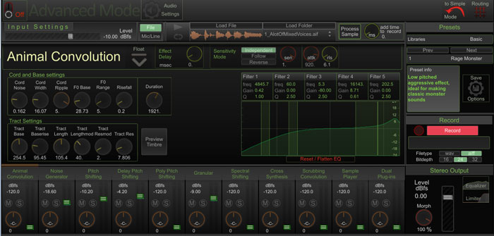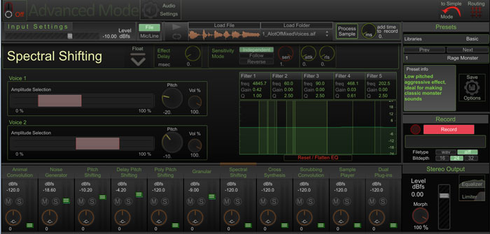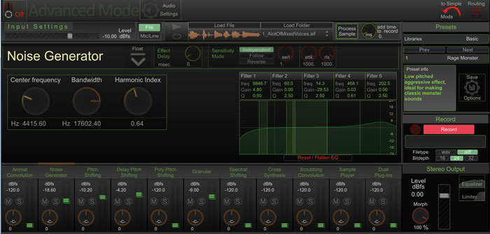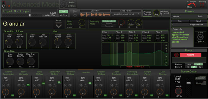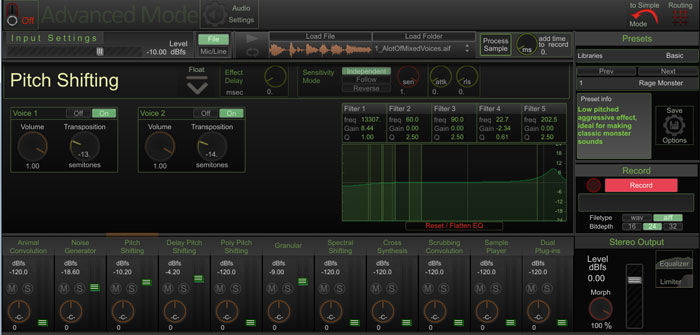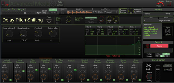 All of the mentioned effects and steps to achieve the monster sounds are available from the get go. Once you have entered the advanced mode you will be presented with an eleven track mixer of various sound processors.