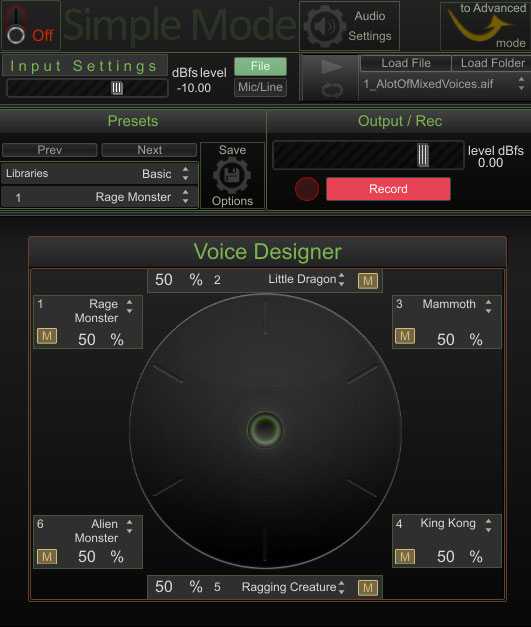 The simple mode has four main (in my opinion) sections – Input section, Preset section, Output section and a Voice designer section. At the very top of the graphic interface you will find the “on and off” button and, right next to it, a button to switch from a simple mode to an advanced mode which I will explain later. The simple mode is, in my opinion, intended for quick works and preset browsing, it accomplishes this job extremely well. I will not explain the input and output sections in great detail as they are quite obvious.