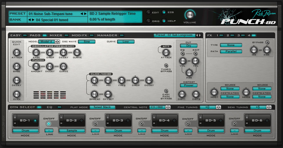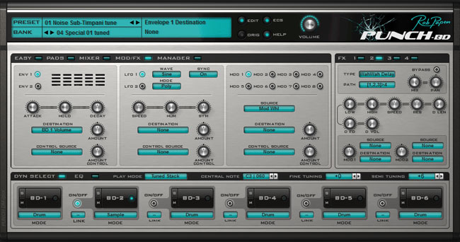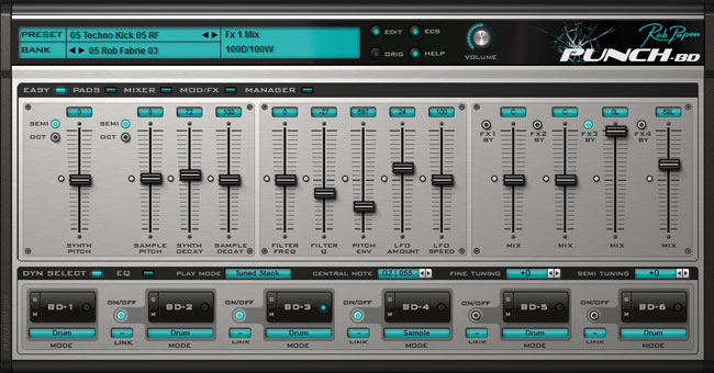 Rob Papen is around for quiet a while and his virtual instruments and fx are featured on various tracks across the charts and clubs out there. Yet the only plug-in I got hold of so far was „RG“ a rhythm guitar synth. Some time ago I read a lot about his „Punch“ vst, a drum synth & sampler, but as I am rather lazy and use the same way to edit and process my drums for years, I didn’t feel the need to test it myself. With „Punch BD“ they release a smaller version of „Punch“ with the focus on the bass drum. Not only since Felix da Housecat’s „Kick Drum“ I know of the importance of this very drum and was happy to be able to get hold of a copy of the new Rob Papen instrument this time.