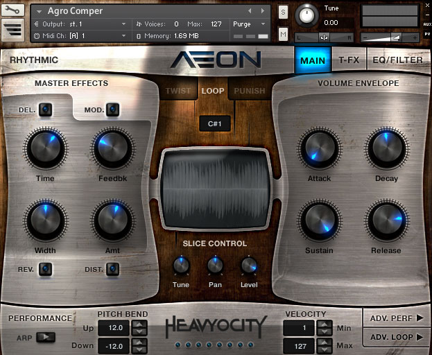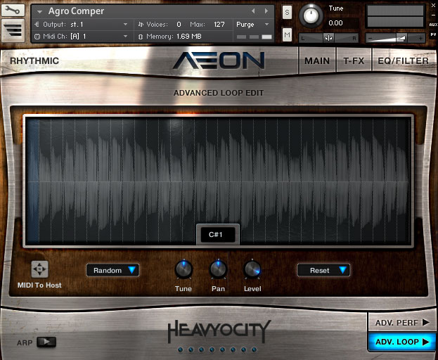 In the same way you can with Damage, it’s possible to control each individual slice of a loop. This is only available with Aeon Rhythmic. Along with the ability to quickly drag and drop slices into your DAW, you can manipulate Tune, Pan and Level for each loop/slice. You can also allow Aeon to randomly select different settings for you, which may lead to some interesting and happy accidents.