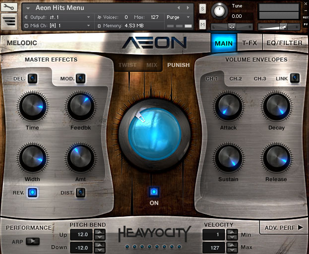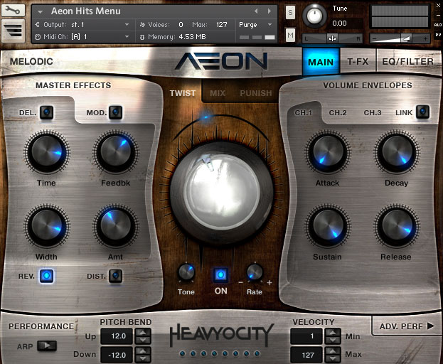 You will find all of your master effects on the left side of the instrument while on the right you have your volume envelopes (three for each layer and ability to link them). The middle of the instrument is reserved for basic mixing (level, tune and pan) and manipulating the sounds with “Twist” and “Punish”.