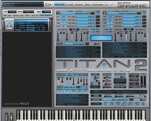 If you want the sound & functions of a particular synth, you still will have to buy that very synth. Titan 2 cannot replace it. I think it is easier to explain with two examples. The synth “Blayd”, where Best Service most likely sampled Rob Papens “Blade” has very good Sounds from Blade, but the thing about the original toy is, that you can use an X/Y Pad to tweak the sounds, which of course is not possible with the sampled version. Also an other example.