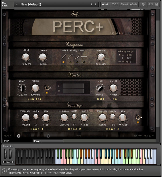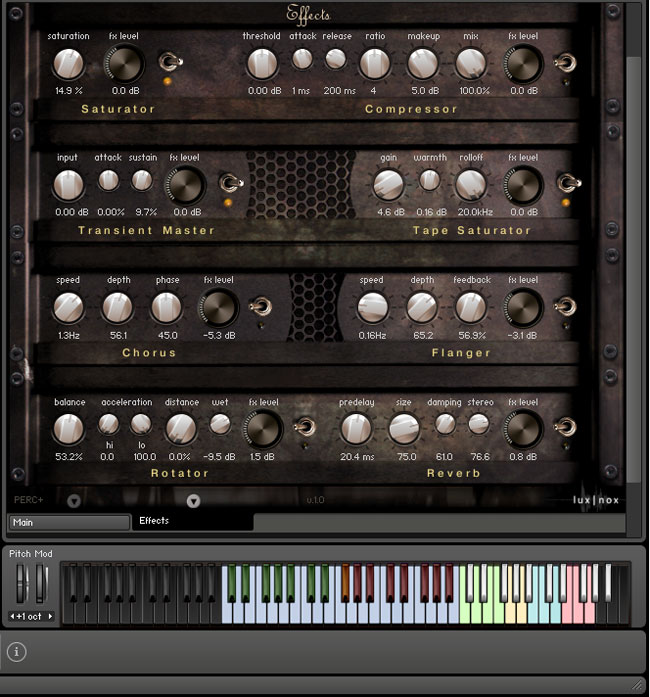 For each instrument there are two tabs in Kontakt. “Main” & “Effects”. They do always look the same and feature the same knobs for each patch. “Main” features the most important settings like “response”, “limiter” and “EQ”. “ Effects ” displays eight more of Kontakt’s own effects; transient master, saturator, compressor, rotator, tape and three effects routed as send fx; chorus, flanger and reverb. The graphic design is simple and yet attractive. With a dark background and bright knobs, the settings are very well displayed; The keys of the keyboard are sorted by colors within the patches. This color – code gives you a hint which sounds are similar and sometimes are even the same sounds in various velocities.