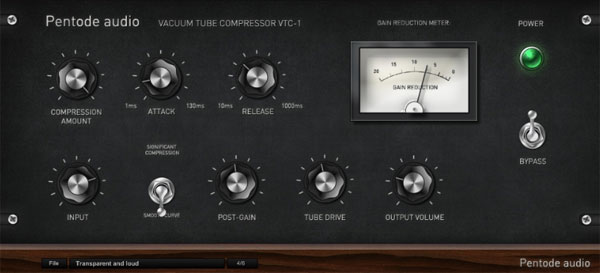 Compared to modern compressors PENTODE AUDIO VTC-1 has different inner structure and principle of work: VTC-1 don’t have threshold knob, so you set amount of compression by increasing or decreasing input level same like with old analog tube compressors. Compression amount knob is similar to ratio knob at modern compressors. You can select two curves of compression with switch: significant compression or smooth curve. If you prefer fat/massive sound you can boost input signal of vacuum tubes by turning tube drive knob.