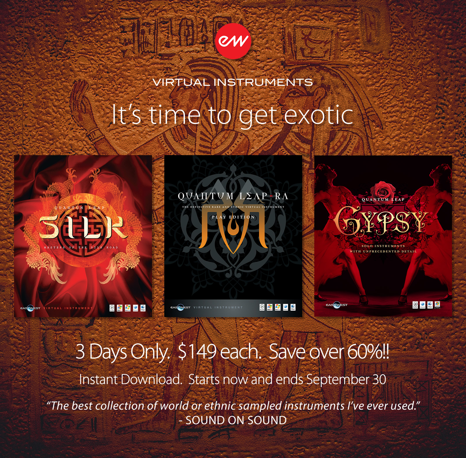Soundsonline announces a 3-day-sale on EWQL’s ethnic/exotic virtual instrument libraries Silk, Ra & Gypsy. Until Sept. 30th, each of the three products is $149 instead of the regular $399.