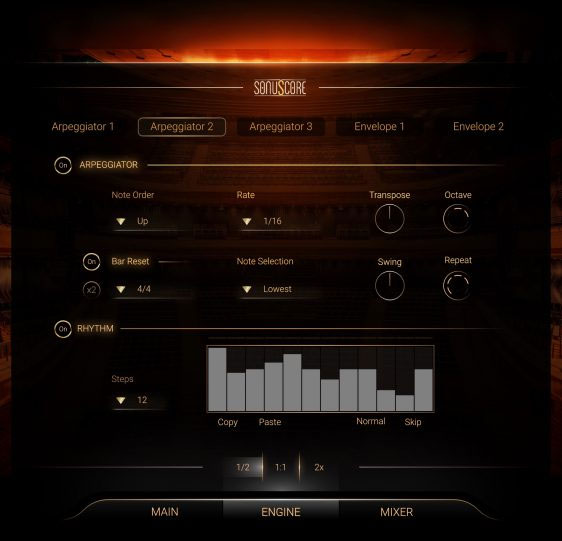 The GUI is pretty simple, so you will be creating your own orchestral colors in no time. For the single instruments, you only have two settings you can tweak. The EQ and the type and amount of reverb. The Orchestra patch GUI is more intricate though. On the main page you will be able to select the desired instruments for your orchestration and selecting a preset of your choice. You can also select to which arpeggiator or envelope each instrument goes. In the engine tab you can tweak the three arpeggiators and two envelopes available. In the mixer tab you can tweak the reverb, volume, EQ and compression of each instrument in the orchestration.