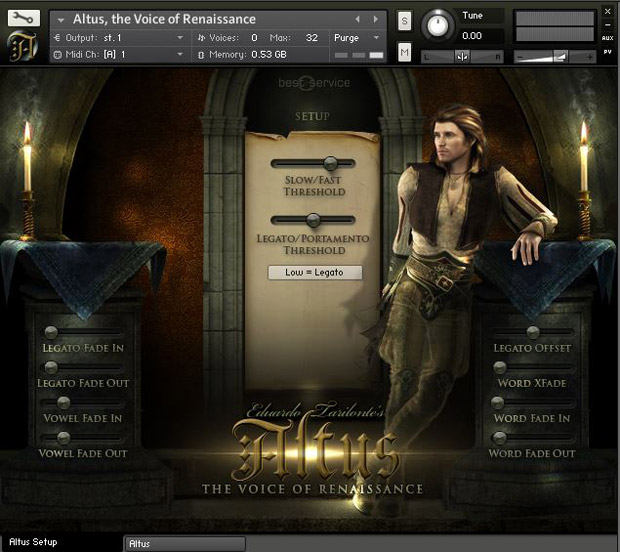 Altus features the now well known five true legatos A, E, I, O, U, and a word builder with more than 130 words and syllables. The voice has two articulations (fast and slow) which are triggered via keyboard when you play softly (portamento or slow spead) or loudly (fast).