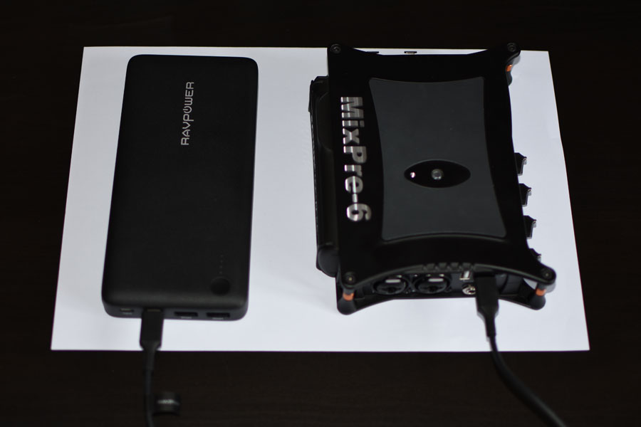 Another powering option is via USB-C. I’m using a 26800 mAh Ravpower battery connected via USB-C but I don’t really like it. The cable can easily be disconnected and both the cable connector and the port on the device can get broken. (This will also result in loss of data since audio does not get saved on power loss.) It is worth mentioning that I recorded for more than 9 hours with two phantom-powered mics and the Ravpower battery was only halfway depleted.