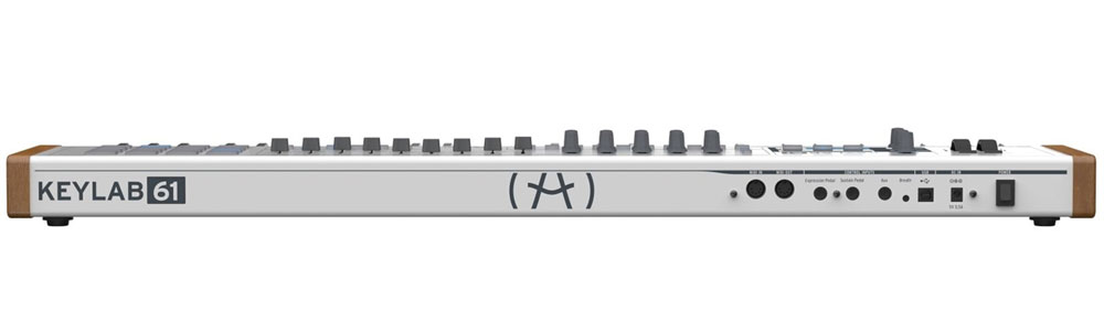 Faders are ok but again they feel a bit cheap. One actually came off right away which didn’t really make a great starting impression but it is nothing compared to the buttons. The buttons are way too loud. The 16 velocity sensitive pads are cool and if I have to compare them I would say they are similar to the Korg PadKontrol. In the back of the Keylab you will find your standard Midi ins and outs, pedal, expression and breath inputs.