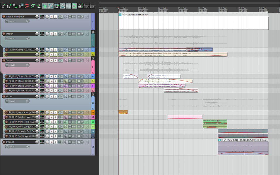 For this example, I created a simple animation of a castle and played with the sounds a bit. No effects were used to enhance the sounds besides layering and minor panning. At the end of the animation, I have pitched one of the files to the extreme. Below you will also find a project screenshot.