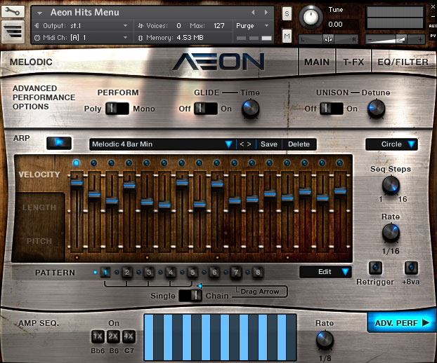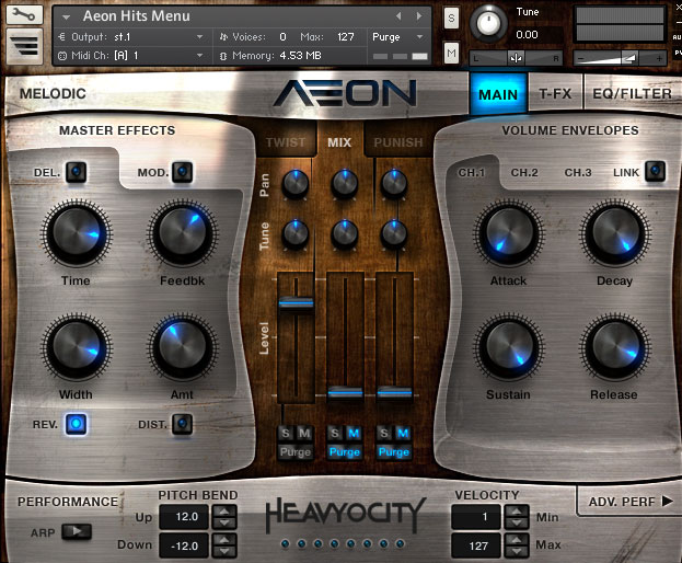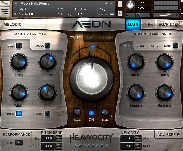 Personally I am not a fan multi tabbed interfaces in Kontakt but I have to say that Aeon does have a nice design which, thankfully, doesn’t look or feel too cluttered (clean is probably the word I am looking for). If you are a “Heavyocity Damage” user then you will find find Aeon’s interface very familiar. However, there are a few additions in Aeon. The following is an excerpt from Aeon’s documentation along with a few additions from myself: