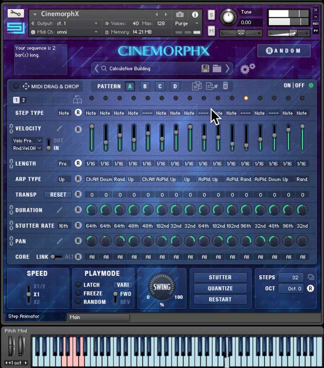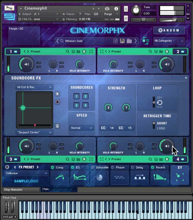 But the presets are only the tip of the iceberg of CineMorphX, since the real point of the instrument is creating your own sounds inside the engine. You can mangle the presets in numerous ways or even create your own patches using up to 8 sound sources simultaneously. You can morph freely between the sounds using a very intuitive XY controller, that is located in the middle of the graphic interface. CMX also has a very complex step animator with which you can create arpeggios & stutters and much much more.