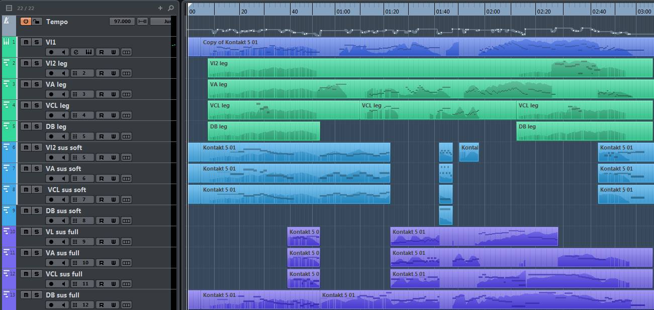 The legatos were recorded in four dynamic levels (p -> FFF), while the sustains come in five (pp -> FFF). Throughout the dynamic range they recorded a »molto espressivo« vibrato playing style, which gives the library a unique sound, that is very suitable for emotional, »romantic« type music. The Section registers are: Violins (G3-C6) Violas (C3-G5) Cellos (C2-C5) Basses (C1-C3). I often found myself wanting a few more higher notes in the violins and cellos.