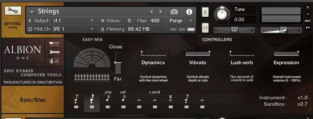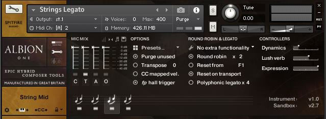 The GUI for Albion orchestra is the same as for most of the more recent Spitfire releases. The GUI is very intuitive and consists of the main window and settings windows. On the main window you can select your desired articulation, adjust the dynamics, expression, vibrato and reverb. You also have a quick room-close mic mixer, that can be useful, but must be used with caution, since the slightest movement of the fader alters the sound quite drastically. Luckily you are able to adjust all the mic positions in the settings tab. The abundance of mic positions makes it very easy to get your desired sound. Also in the settings tab you will be able to adjust the tightness of the samples, round-robin control, purge samples and various other settings.