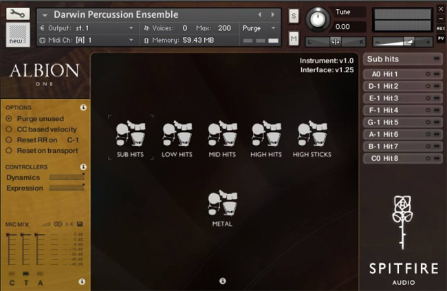 As Albion orchestra, Darwin percussions have been recorded in the Air Studios hall with the same microphone setup and an additional close microphone. The sound is very natural and the instruments available can produce a big array of timbres. From soft rhythms too massive hits. I do not know the details about how many round-robins and dynamic levels are available, but my impression is, that there are many of both. Even creating rolls and flam effects is a breez with Darwin percussions.