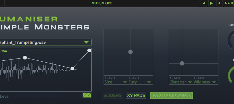 Fortunately, Simple Monsters’ reference manual provides some clues on the actual effect of sliders. The sliders Size and Age control the pitch of the audio material and work in relationship to each other. While Size can be seen as a coarse pitch shifter ranging from the voice of a child to that of a giant, the Age parameter acts in a bit more delicate fashion. It seems to also simulate a “throat length” effect, with which you’re able to turn a female voice into a male (and the other way around).