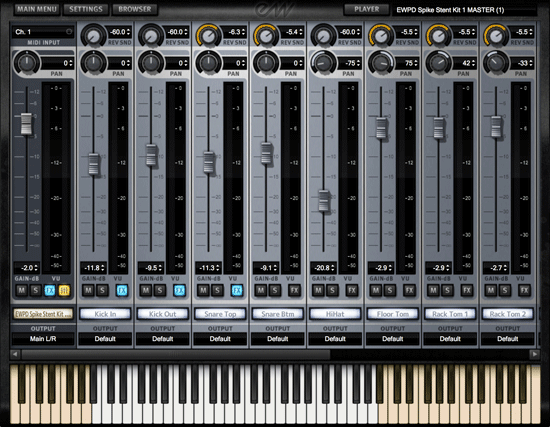 The Spike Stent volume (Volume 1) includes Drum Workshop, Slingerland, Gretsch, Ludwig, Yamaha, Orange County, Zildjian drums, hi-hats and cymbals recorded in five different rooms. It has seven different kits to choose from, each with several different variations of the selected kit such as Pop, Rock, Punk, Ballad, Industrial, Electro, heavily effected mixes and Dry and Master mixes. Each of these different mixes are basically like presets which have selected mics turned on and might have certain FX applied to the instruments to create a unique sound. The Master mix has all the mics turned on.