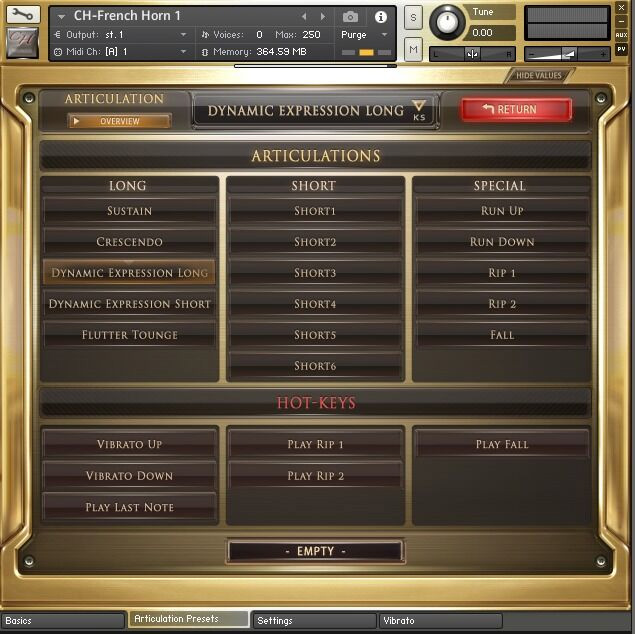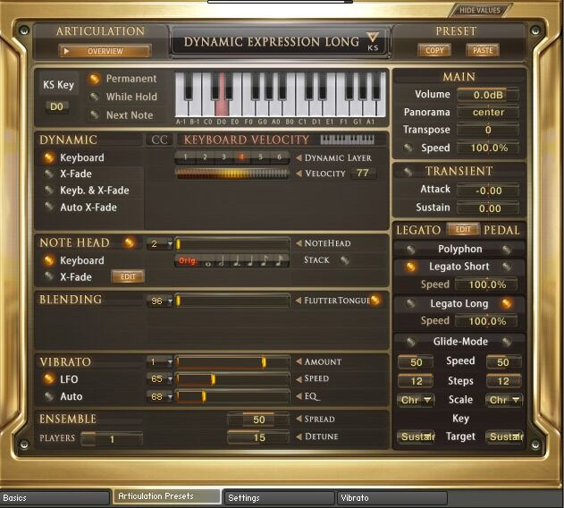 By clicking on the second tab underneath the interface labelled “Articulation Presets“, you’ll be directed to a more elaborate control interface. Most of the options, like the articulation switcher, dynamic layers, note heads and vibrato should be already familiar if you own another Chris Hein product.