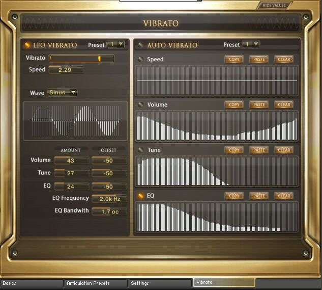 The somewhat misleadingly labelled “Vibrato” tab offers elaborate customization options regarding the vibrato – or rather tremolo – technique of the instrument. Here, you’ll find lots of modifying options concerning the amount, speed, volume and tuning of your artificially generated vibrato.