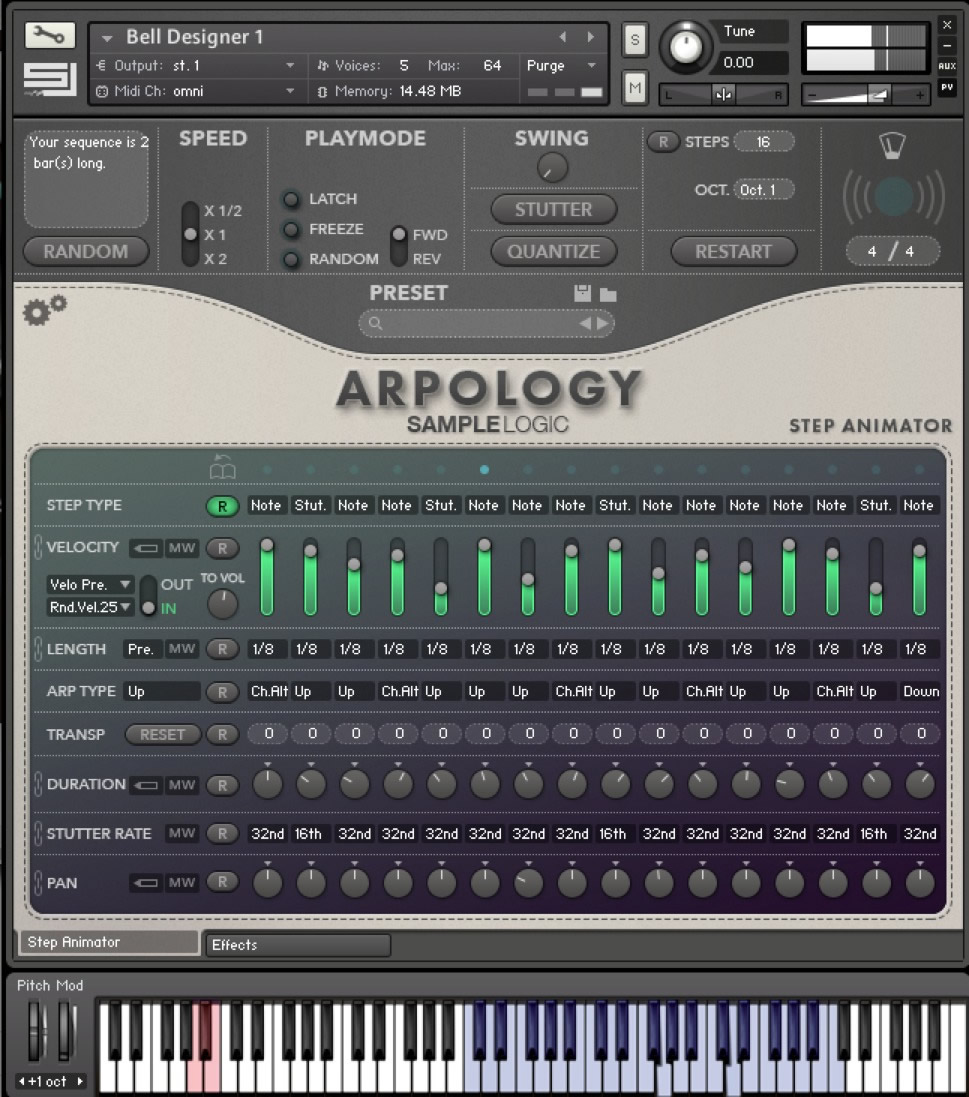 The arpeggiator consists of eight parts namely step type, velocity, length, arp type, transpose, duration, stutter rate and pan. With the latest update the arpeggiator can be also switched off in order to play samples as they are and midi drag and drop function has been added which translates midi data into the notes that you can drag into your DAW of choice and use with any other instrument if you wish so.