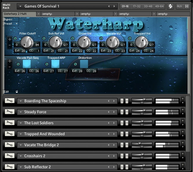 Among patches you will find all sorts of loops, ambiences, stingers, drums and other various musical aspects of the waterphone manipulated in such a way that it will work with your creations. Here is a brief list of the group of patches: