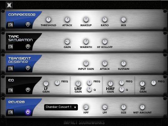 All the mic positions have different adjustable parameters such as the stereo width of each stereo mic position, an offset knob to adjust any timing issues with the mics. Keep in mind though that the offset setting cuts away from the beginning of the sample according to how high you set the value (ms) to. Recommended to be used mainly with the far way mics to correct delay between mics if needed.