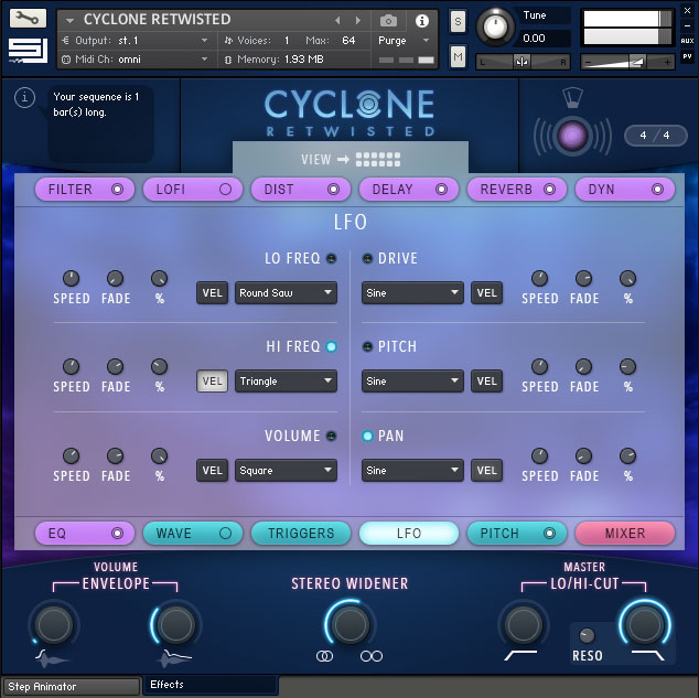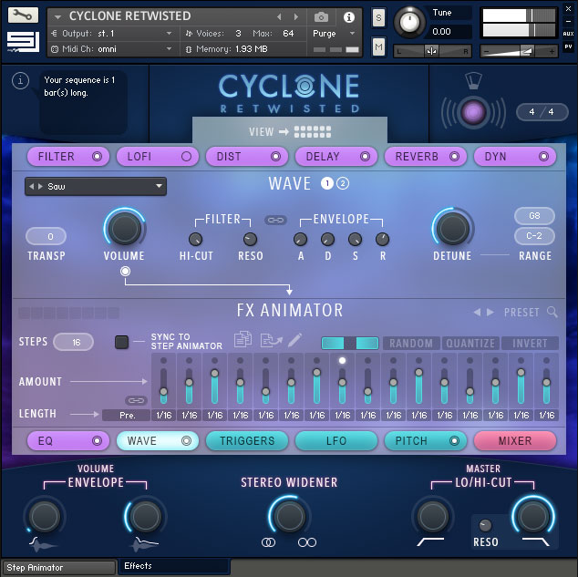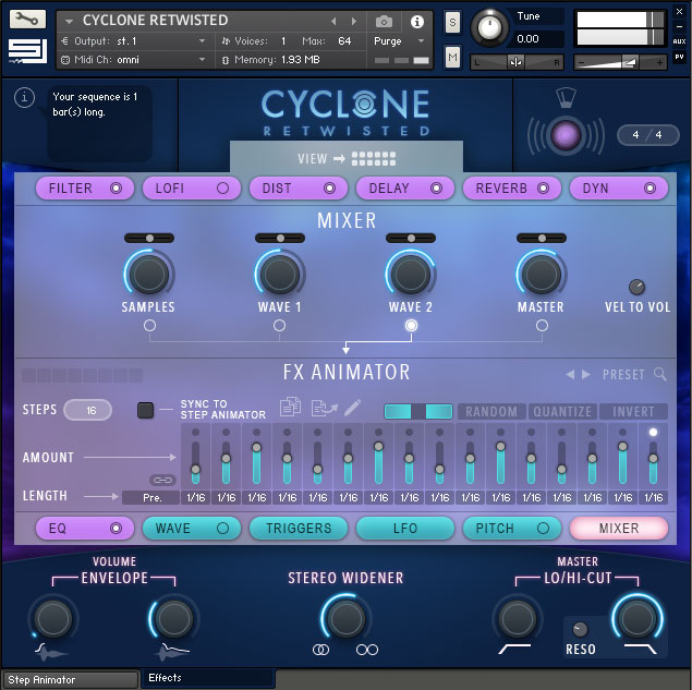 CYCLONE 1.0 introduced Sample Logic’s additive synthesis engine, “Wave,” and now CYCLONE RETWISTED takes it to the next level with 41 wave shapes to choose from, and a dual-voice engine with independently-controllable volume envelopes, hi-cut filters, and FX animator engines. With this newly expanded, transposable wave section, waveforms can be added to the instrument’s overall sound, leading to endless customization and massive synths. In addition, each waveform volume can be sequenced via a Animators. Wave can be used in many ways, here are just a few examples: