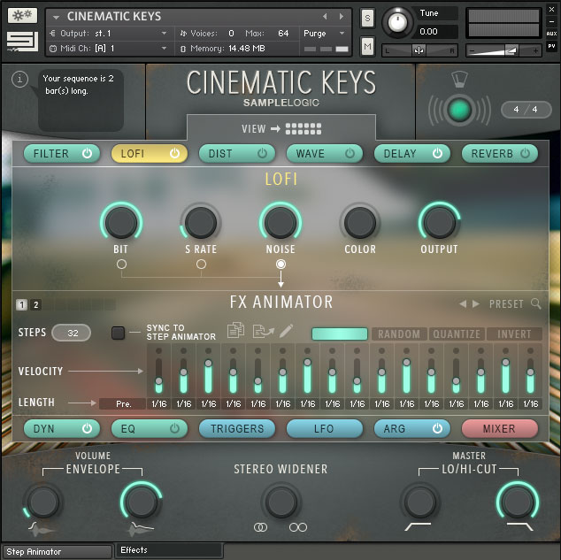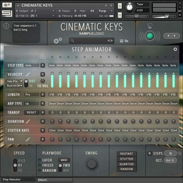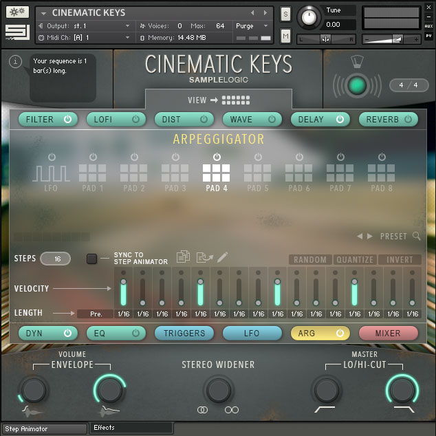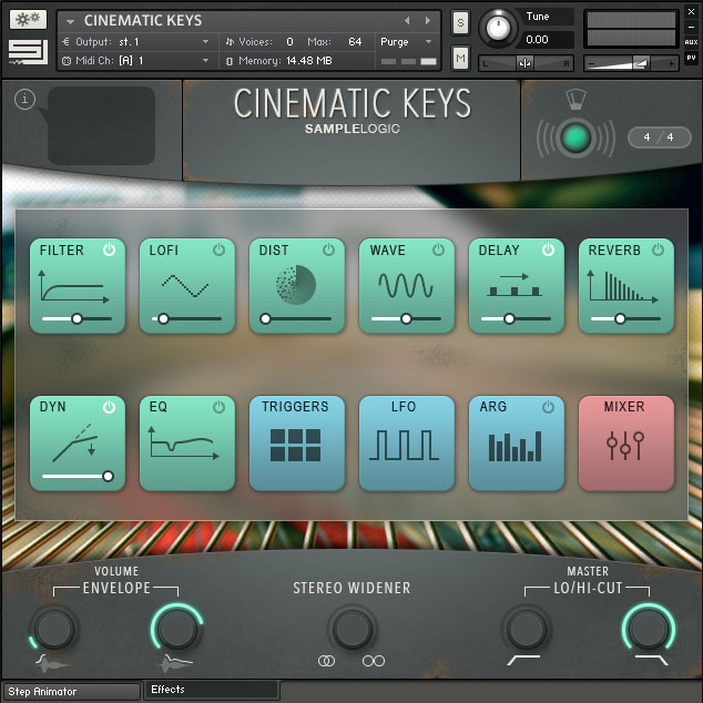 CINEMATIC KEYS represents a major enhancement to Sample Logic’s award-winning Kontakt user interface. Easily control eight real-time audio effects, displayed in a beautiful tiled interface right from the home screen of every CINEMATIC KEYS instrument. The interface also includes a bypass ArpeggiGator, Triggers with 64 preset effects, and an LFO section to make things wobble! This is all topped off with the powerful Step Animator engine, first introduced in ARPOLOGY. The Step Animator allows for modern-day sequencing and arpeggiating of sounds over time on a per step basis.