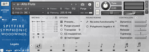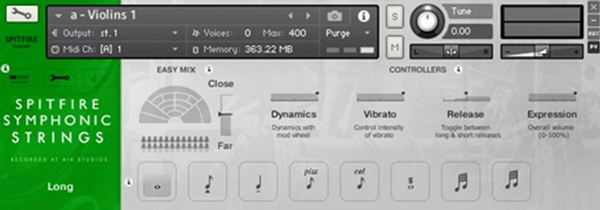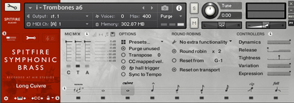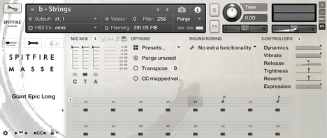Users of other Spitfire libraries will already be familiar with the GUI and will be able to delve right into it. New users won’t have a big problem, since the interface is as straight forward as it can get. On the main page you will be able to select your articulations, tweak the vibrato, dynamics, release, tightness and expression of the samples (also vibrato in the strings). You also have a handy easy mix fader which fades between the close and far mics. For quick fixes it’s OK, but I suggest tweaking your desired mic positions in the settings window, which can be accessed by the little wrench icon on the left hand side of the GUI. In this window additional settings can be adjusted, such as how you want your round robins to performer. You should also try playing around with the Ostinatum which is not really an arpegiattor and not quite a sequencer. Spitfire says about Ostinatum: “This intuitive device allows you to build up complex patterns that react to your playing to achieve wild systems results tantalisingZimmeresque tension beds or cheeky multi-tonguing effects!” All in all GUIs don’t get much more straight forward than this one.