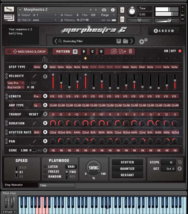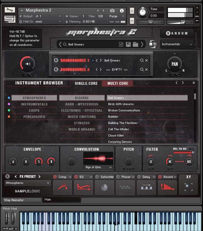The real fun with Morphestra 2 comes with creating your own presets and sounds, since the real point of the instrument is creating your own material. You can mangle the presets in numerous ways or even create your own patches using up to 8 sound sources simultaneously. You can morph freely between the sounds using a very intuitive XY controller, that is located in the middle of the graphic interface. Morphestra 2 also has a very complex step animator with which you can create arpeggios & stutters and much much more.